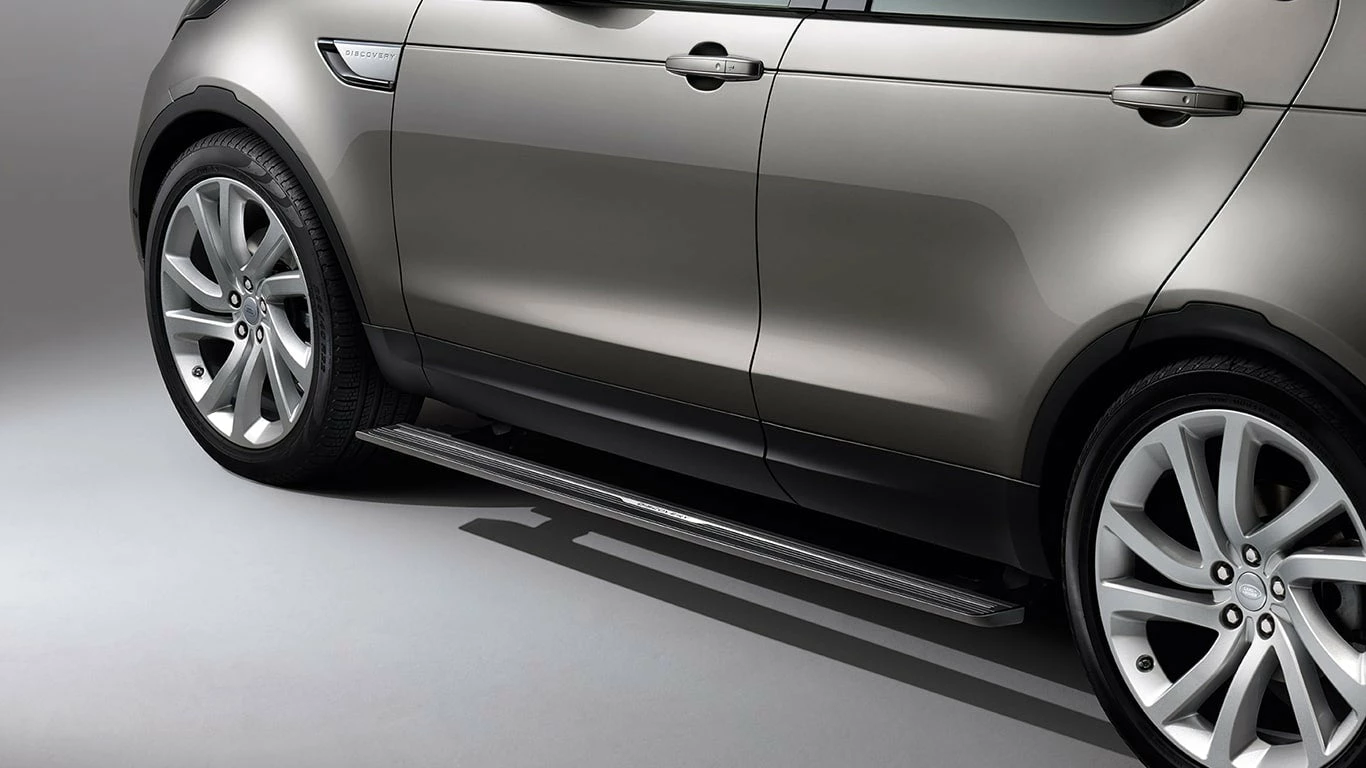 Die ausfahrbaren Trittstufen erleichtern das Ein- und Aussteigen. Diese fahren automatisch beim Öffnen einer Tür automatisch oder mithilfe der entsprechenden Taste auf der Funk-/Fernbedienung aus. Nach dem Schließen der Tür fahren sie automatisch wieder ein. Das Dekorelement besteht aus Edelstahl und hat eine Lasergravur mit einer Discovery Aufschrift.