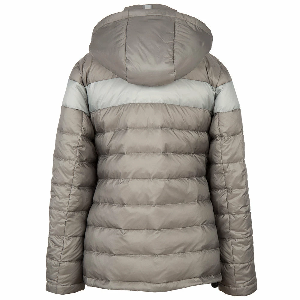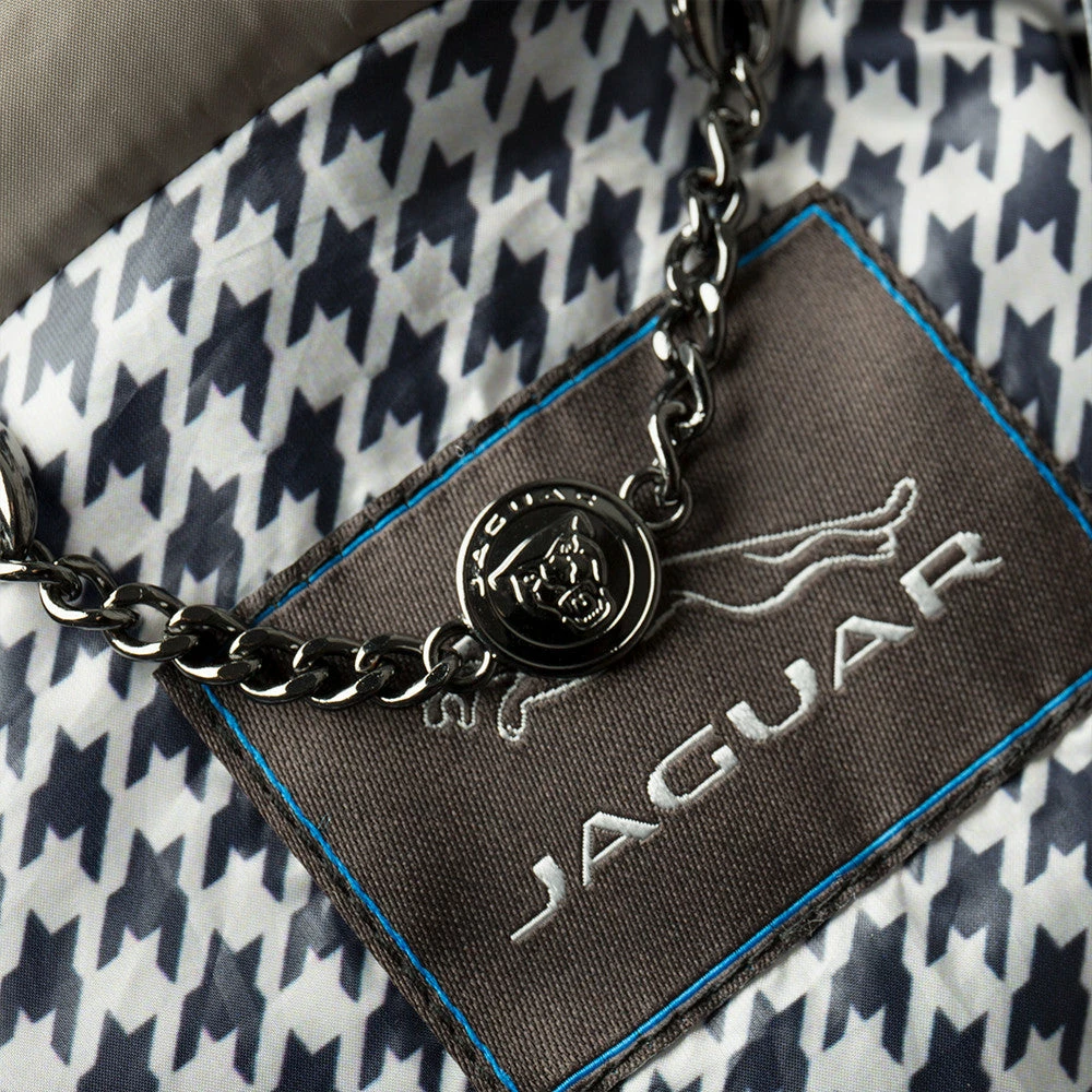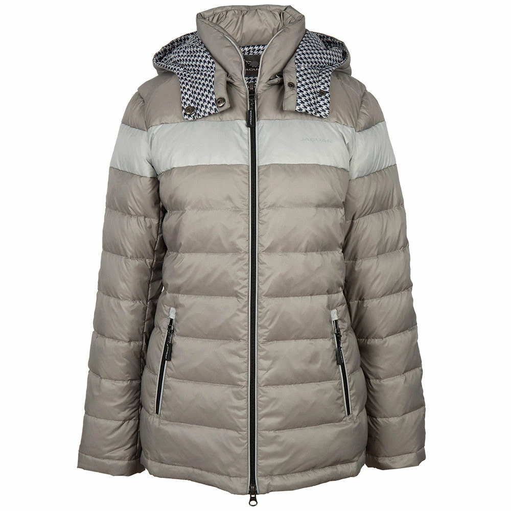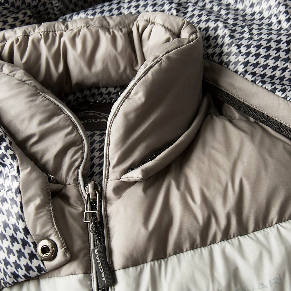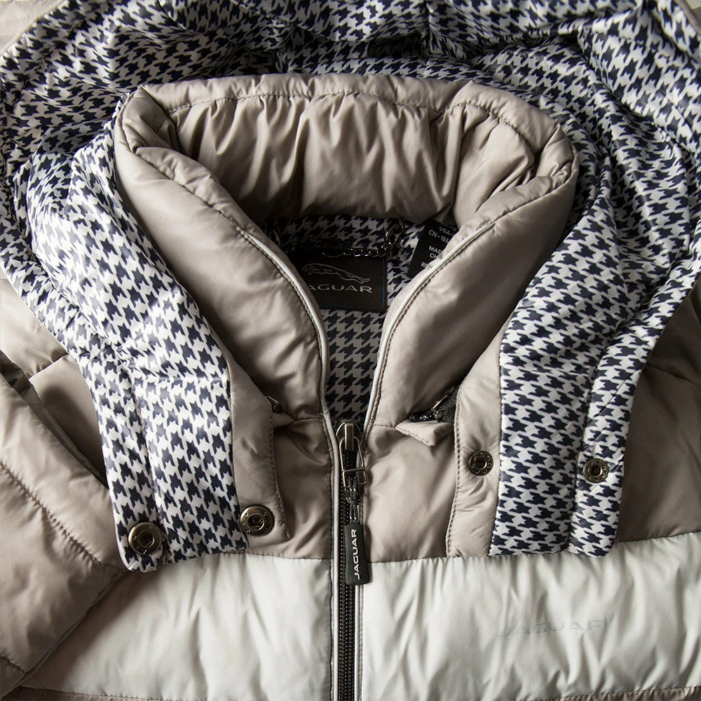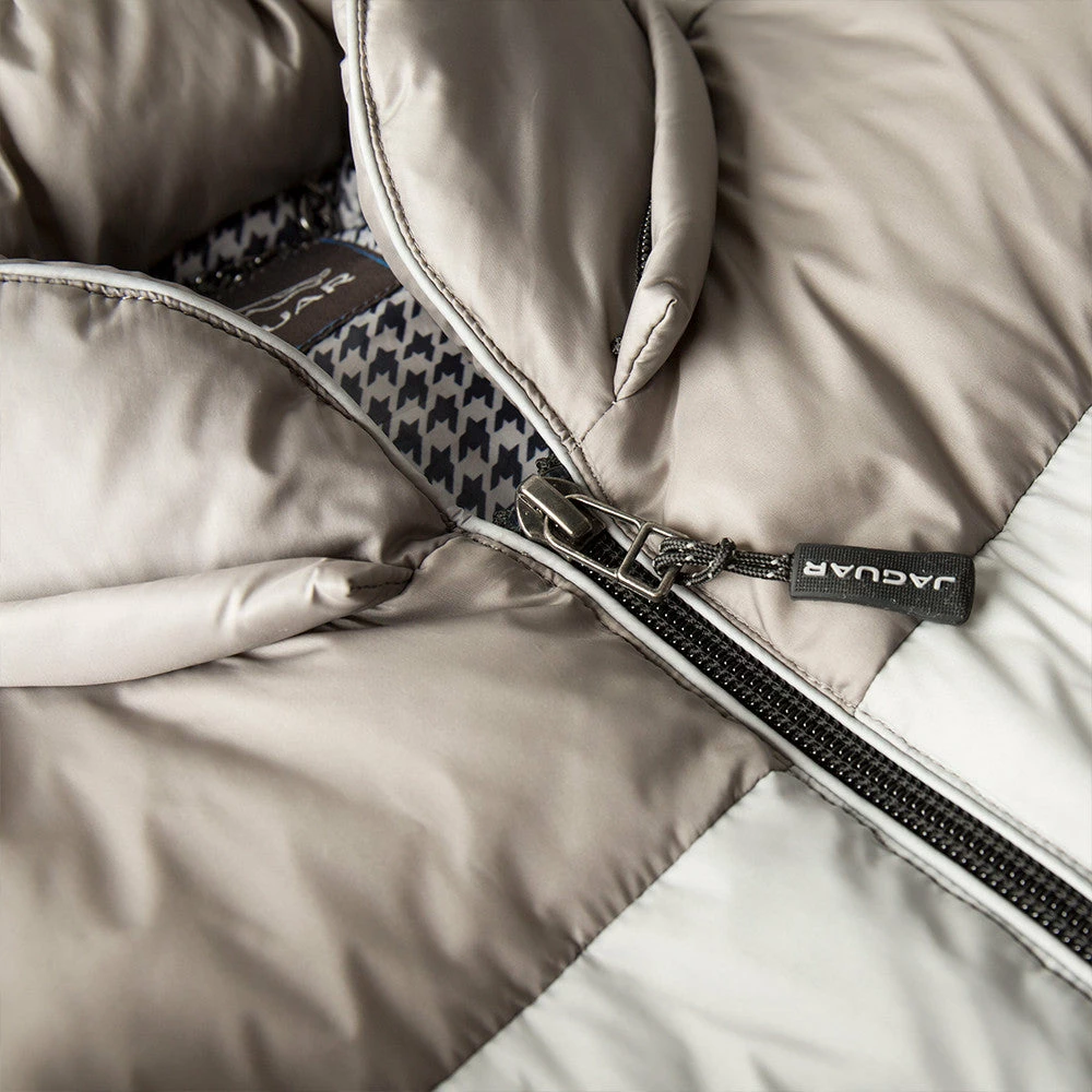Graue Winterjacke mit Füllung aus gemischten Daunen. Einstellbarer Bund, gesteppte Kapuze und Logo auf dem Schieber. Jaguar-Schriftzug auf der Brust.