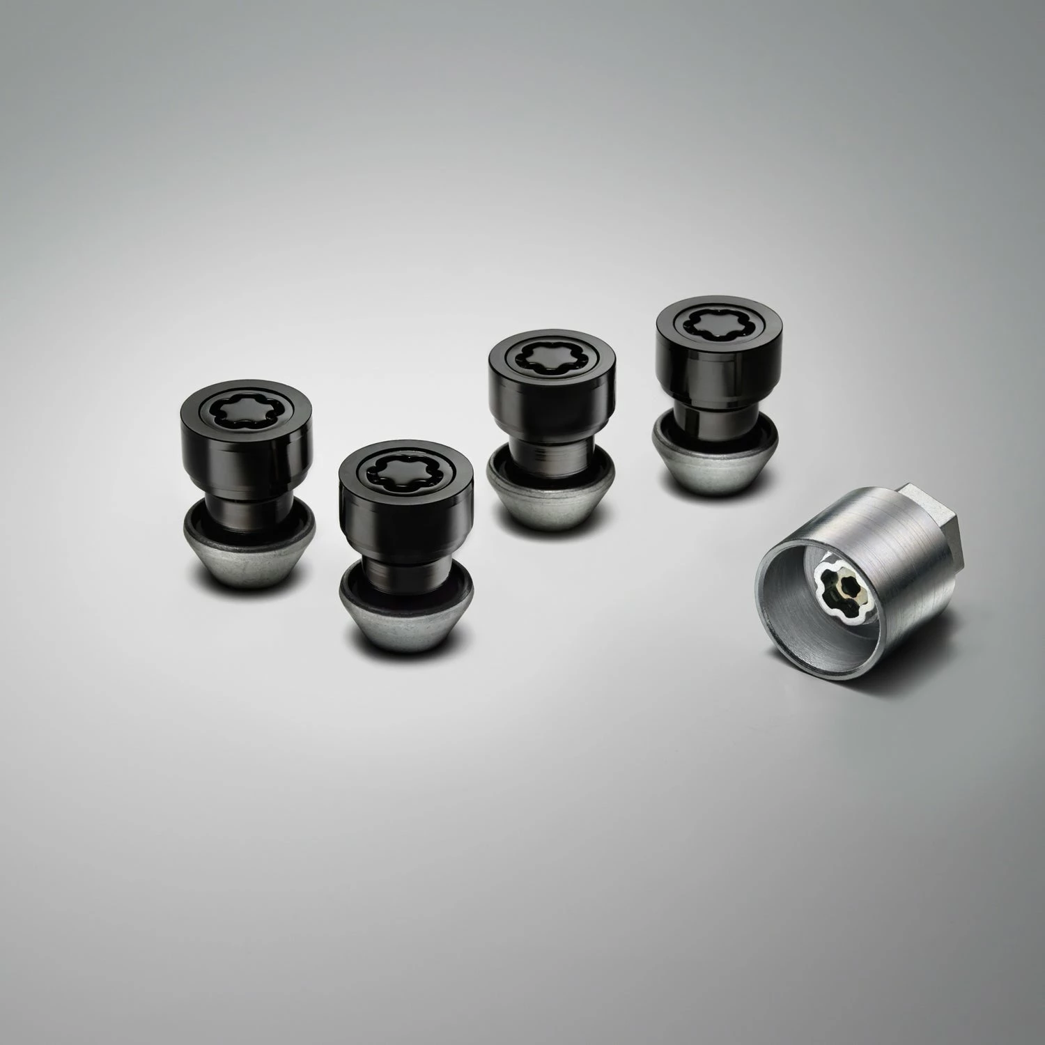 Das schwarz glänzende Set besteht aus vier Muttern und einem Schlüssel.