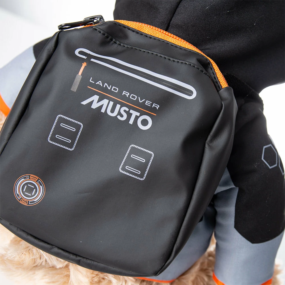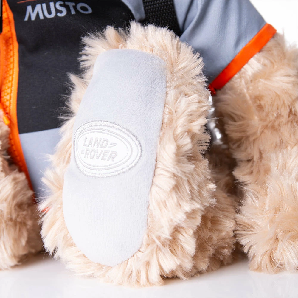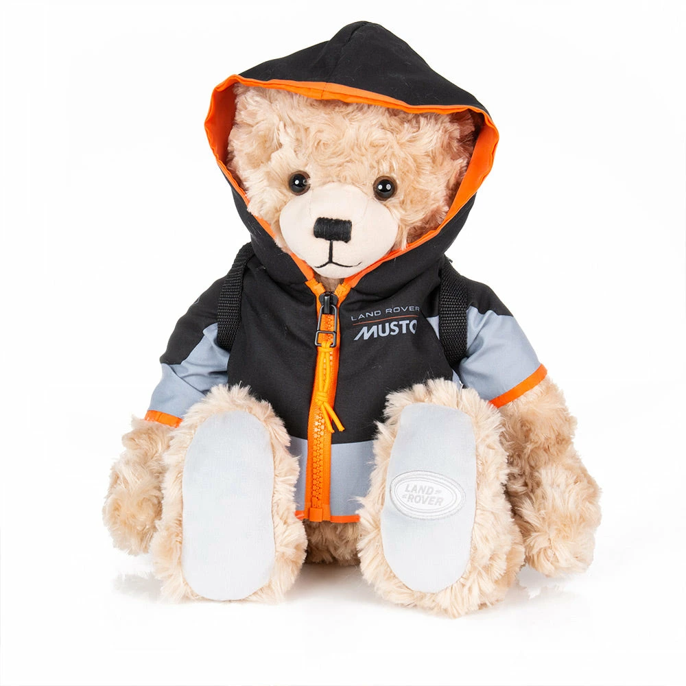 Der Teddybär trägt eine abnehmbare Land Rover x Musto Jacke und einen abnehmbaren Rucksack.