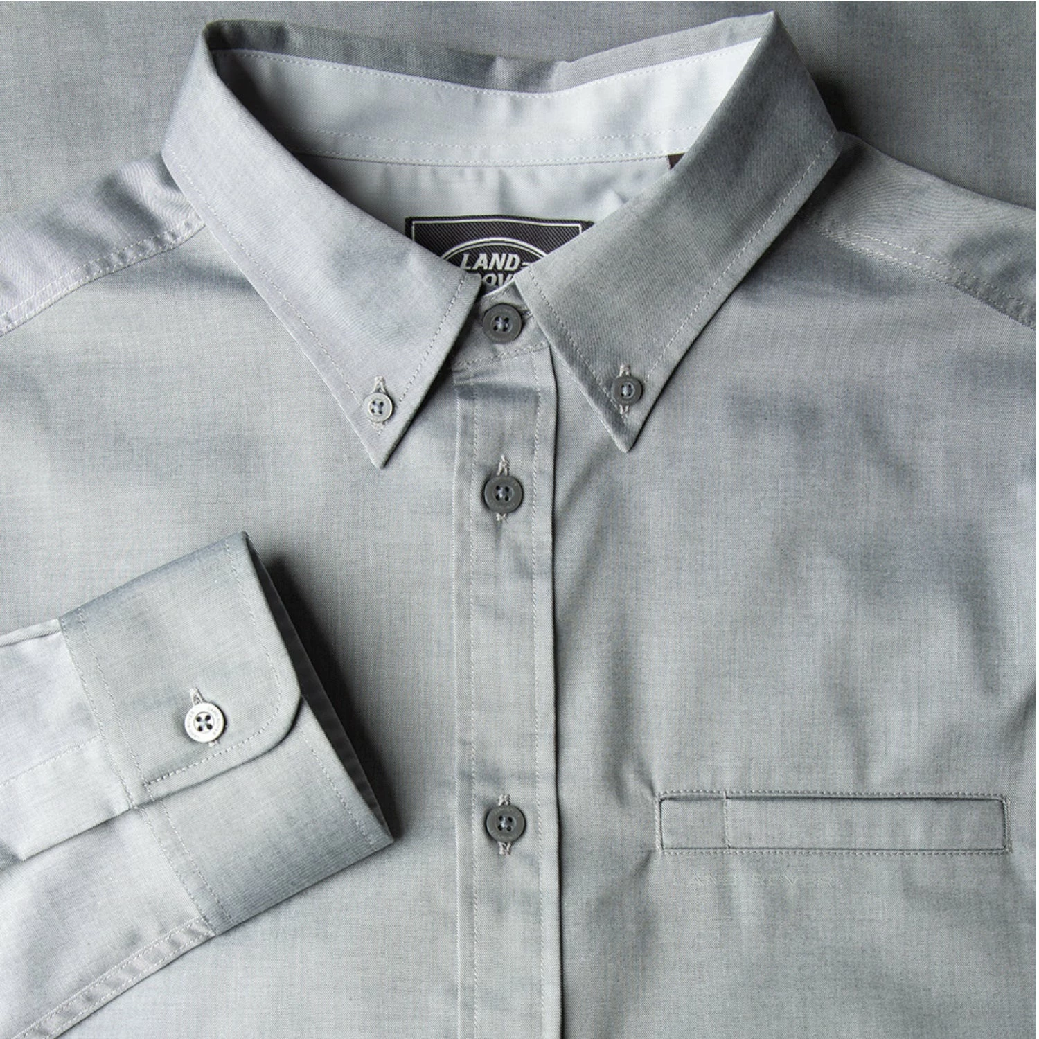 Hochwertiges Land Rover Business Hemd in Grau mit dezentem Land Rover Schriftzug auf den Knöpfen.
