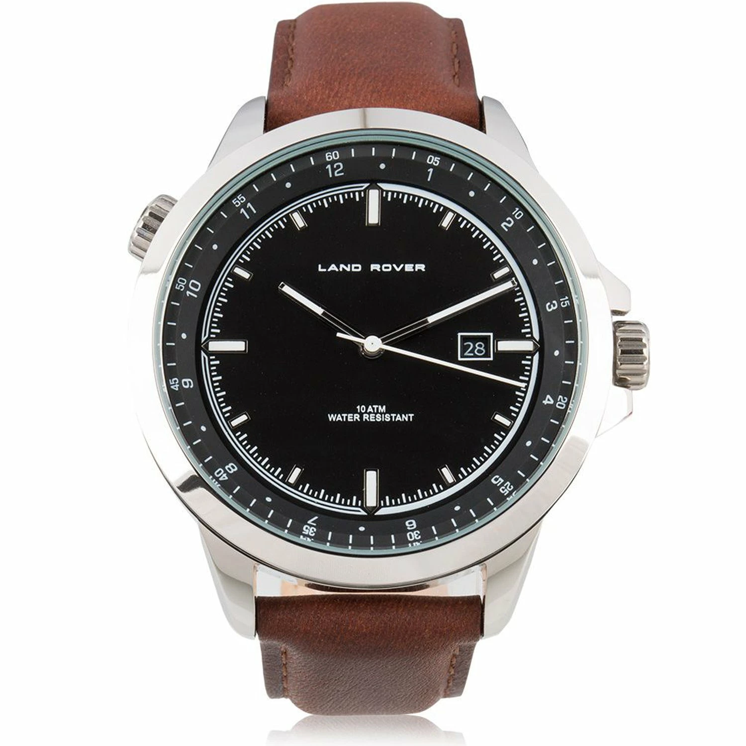 Land Rover Uhr mit Datumsanzeige aus poliertem Stahl. Einstellbare Außenlünette für die Anzeige von zwei Zeitzonen. Land Rover Logo auf der Rückseite und leuchtende Zeiger. Strukturiertes Armband aus italienischem Leder.