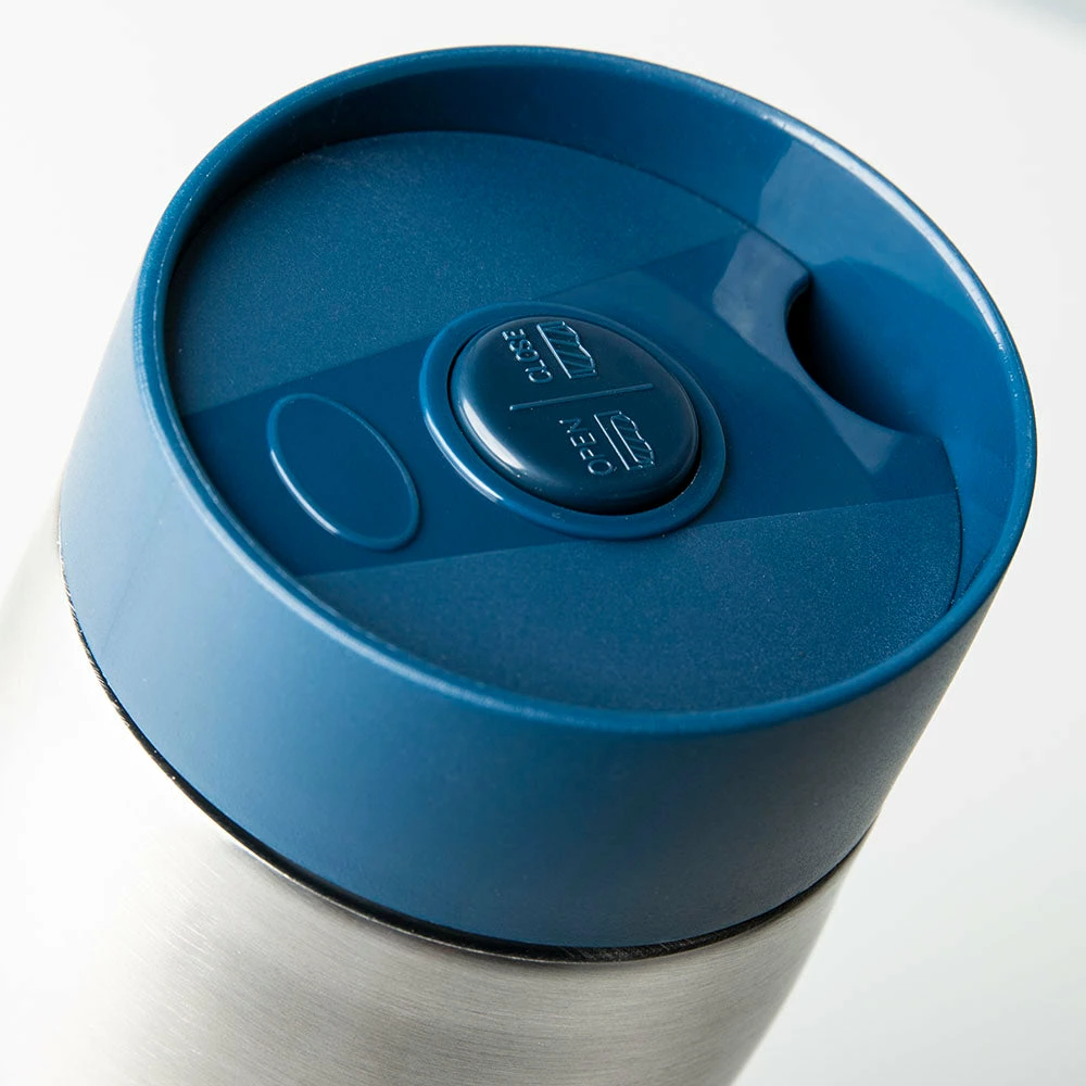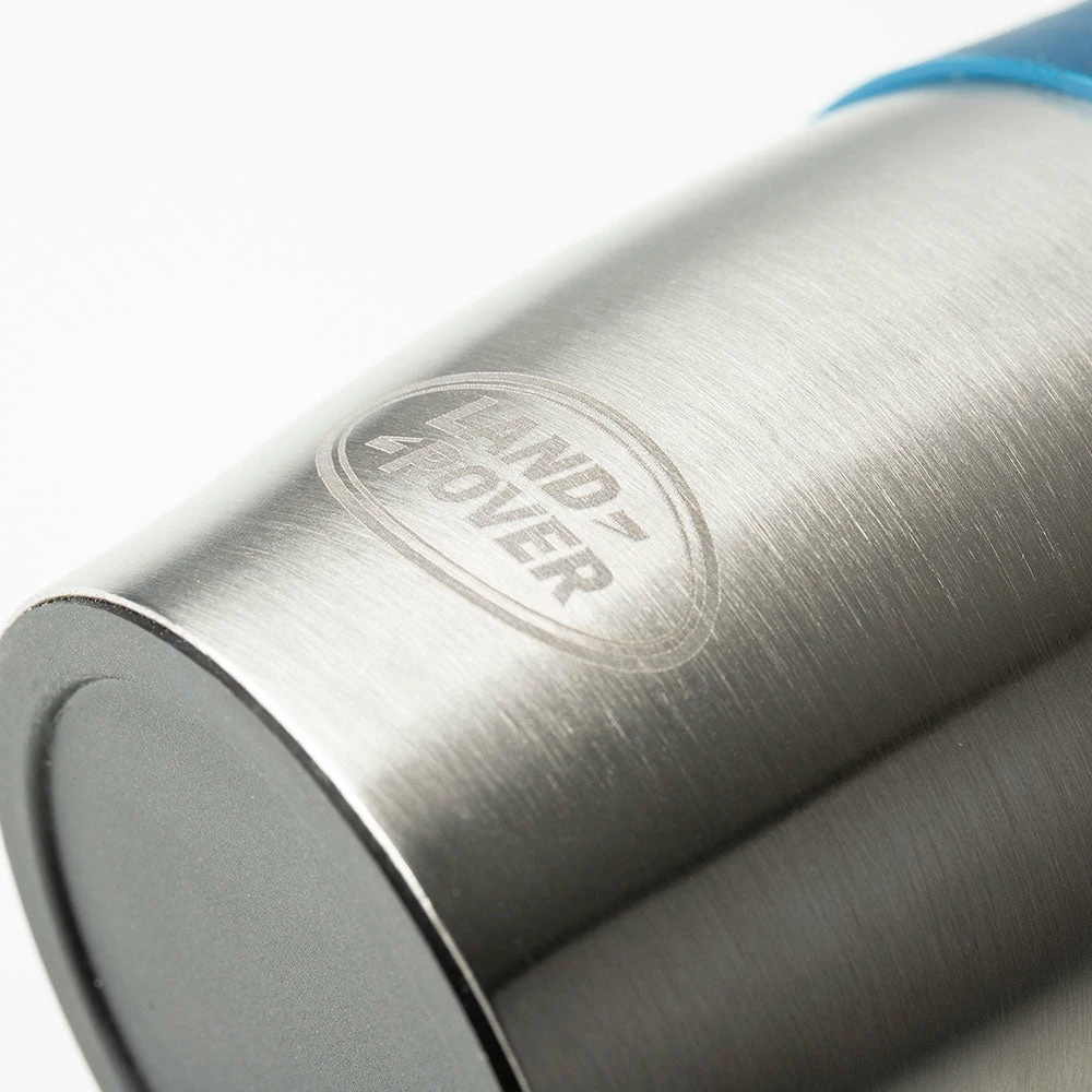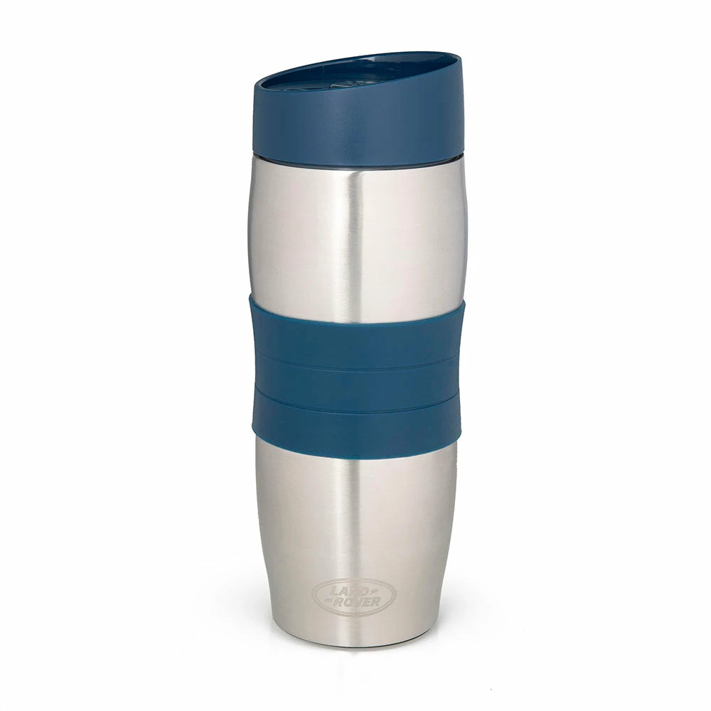 Original Land Rover Reisebecher aus Edelstahl mit marineblauen Applikationen.
