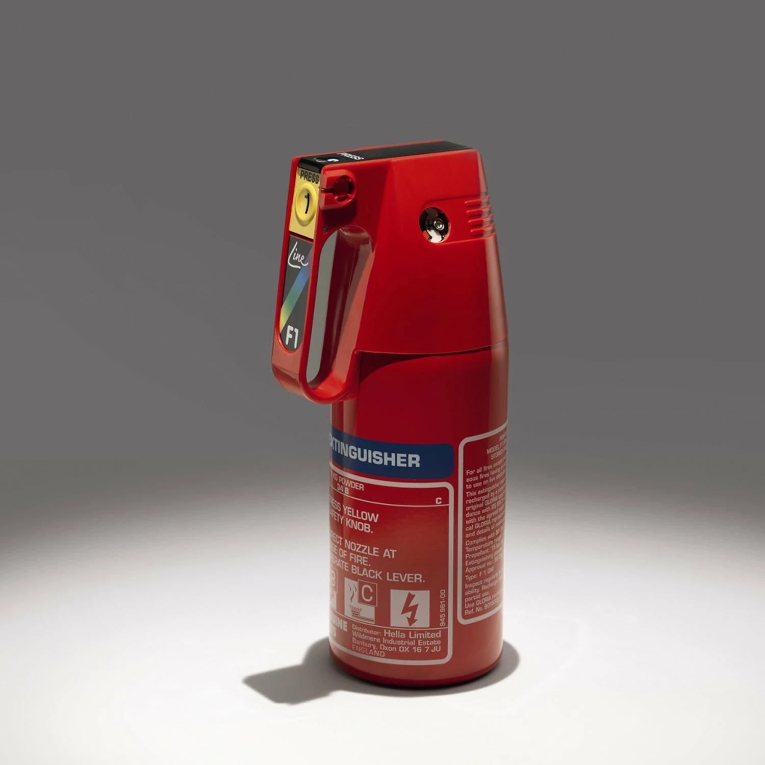 Pulverlöscher (1 kg) mit Montagehalterung zur Anbringung unter dem Vordersitz. Ein Feuerlöscher im Fahrzeug ist in einigen Ländern gesetzlich vorgeschrieben.