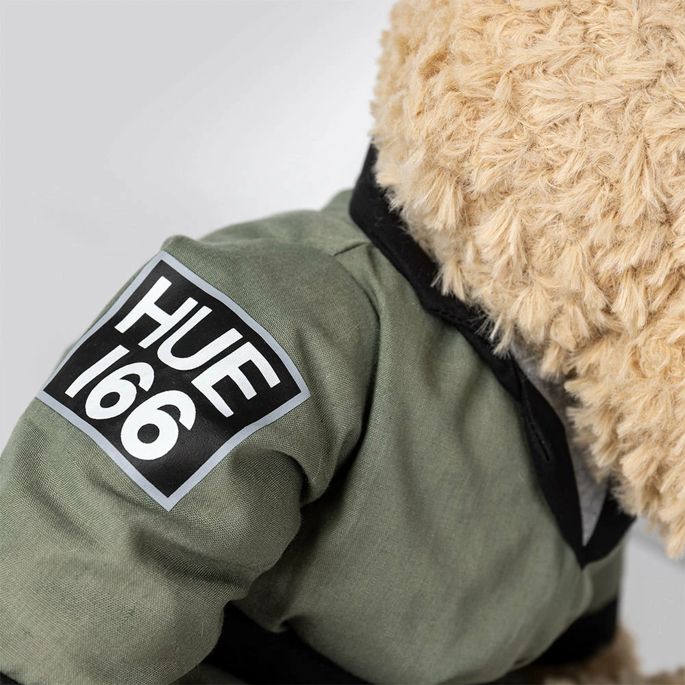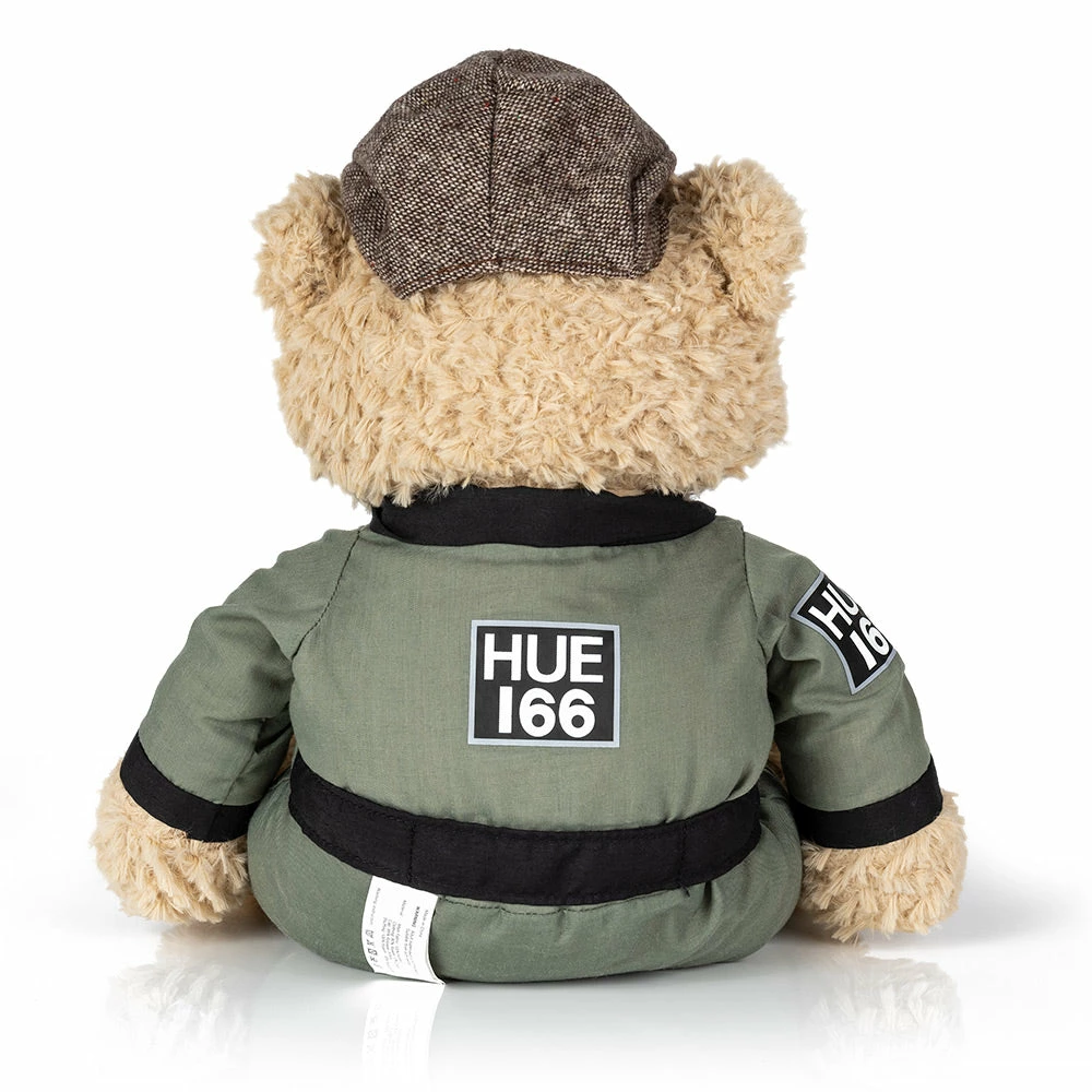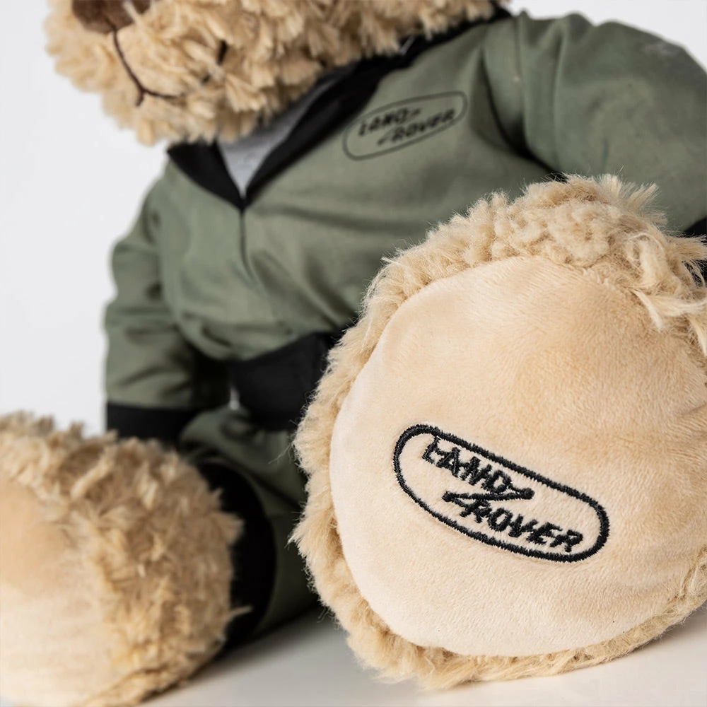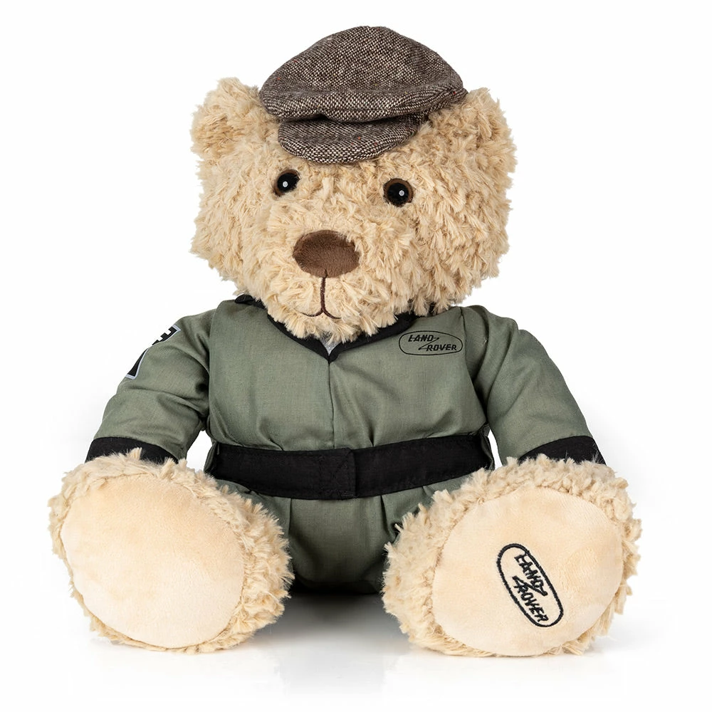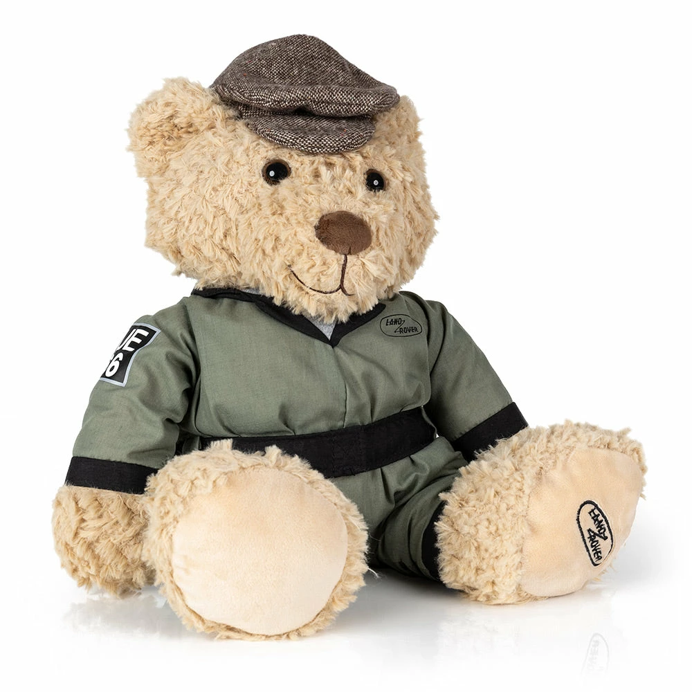 Original Land Rover HUE Teddybär. Der Goldbraune Teddybär trägt einen grünen HUE 166 Overall und eine braune Fliegermütze. Auf der Unterseite seiner Pfote befindet sich das gestickte Land Rover Logo.
