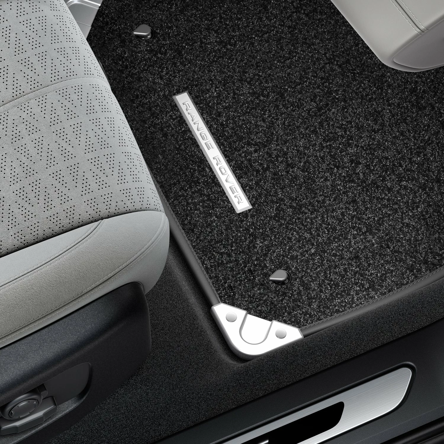 Original Range Rover Premium Fußmatten aus hochflorigem Velours (2.050 gm²) schützen durch ihre wasserfeste Unterseite den Fahrzeugboden vor Nässe und Schmutz. Mit Range Rover Branding.
