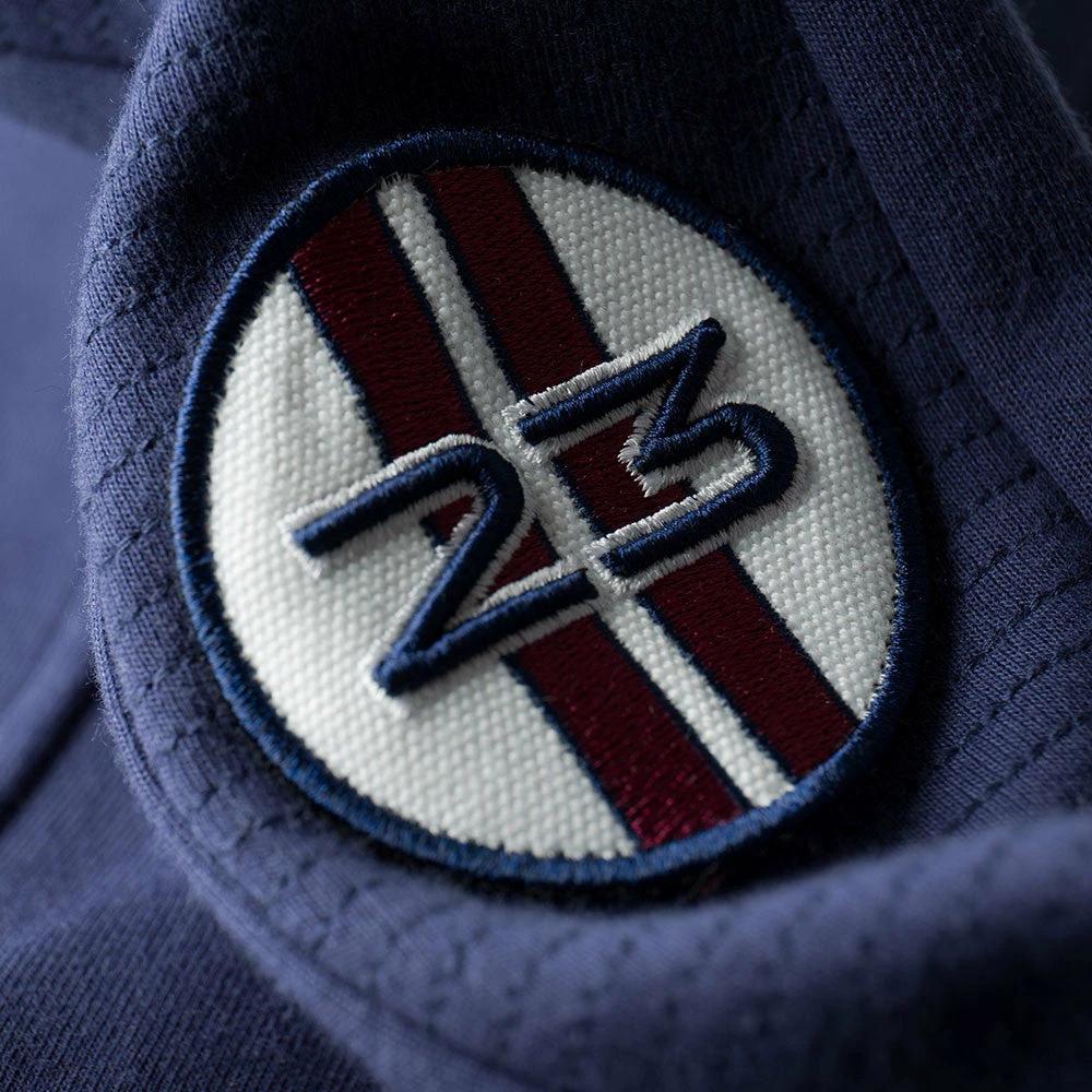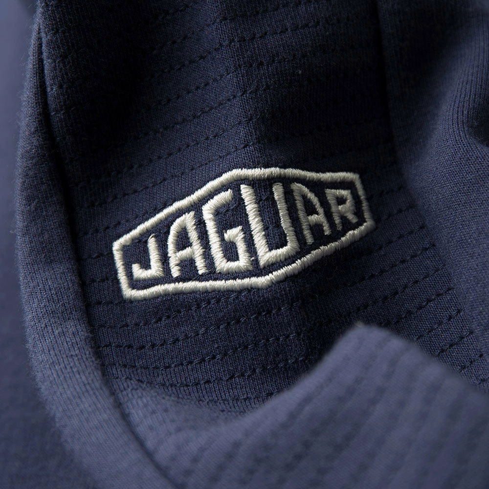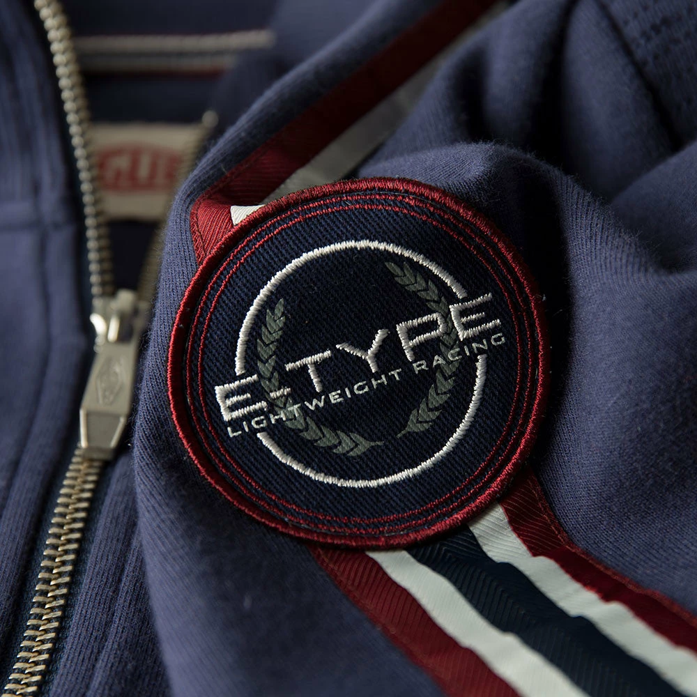 Die Sweatshirtjacke ist mit dem E-Type und dem Jaguar Logo versehen. Zudem hat sie ein Rennstreifenmuster auf der linken vorderen Seite.